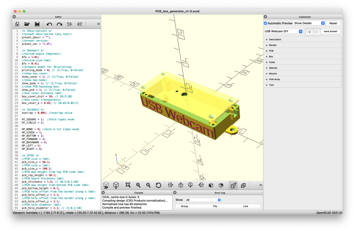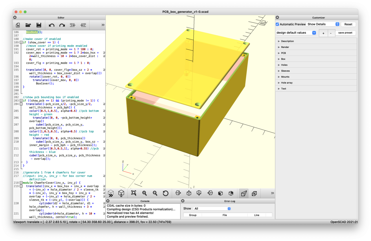 電子工作したPCBを格納するケースがほしいのだけれども、タカチのケースを買うか、そこらへんのプラボックスに穴を開けたりするかを考えなければいけないのだけれども、3Dプリンターを持っているなら良い解決策があります。それがCustomizable electronics box generator。カスタマイズが可能でちょいちょいと設定すると3Dプリンタで印刷できるSTLファイルを出力できます。